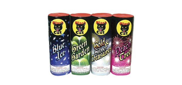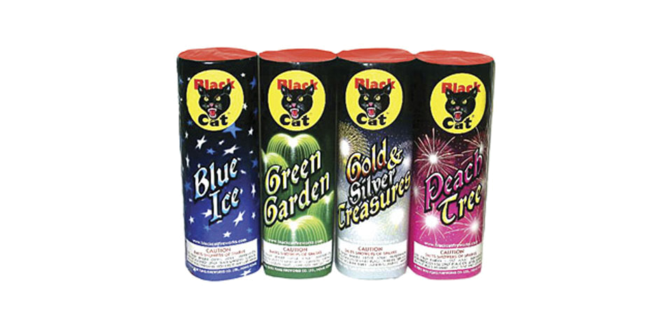 This color-themed quartet delivers a great performance with lots of crackles and glittering effects from the likes of Blue Ice; Green Garden; Gold & Silver Treasure and, Peach Tree. 100 Gram Category (each) Size: 9″ x 3″ Case: 18/1 Fountain Effects: 1. Gold, Blue & Crackle 2. Green & Crackle 3. Gold Glitter & Silver Glitter 4. Red & Silver Glitter