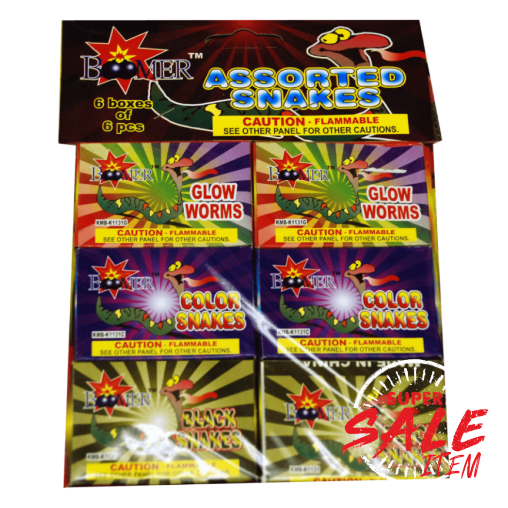 Two boxes each of Black Snakes, Colored Snakes, and Glow Worms. Snakes “grow” after ignited and are great family fun!