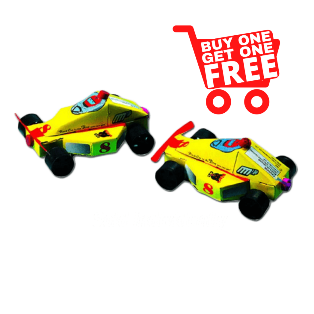 A brightly colored, specially designed hot little race car that moves forward and in reverse with whistles and colored sparks.